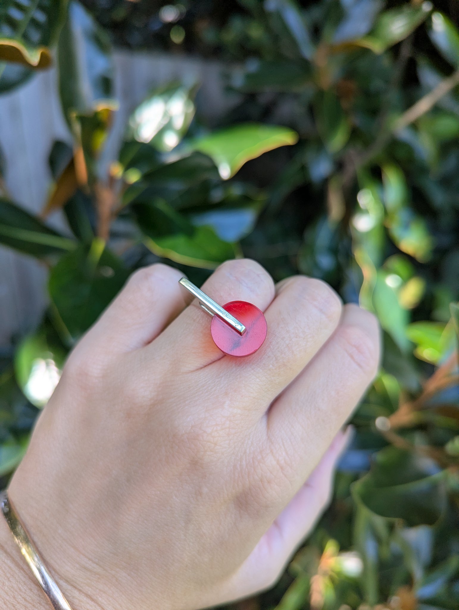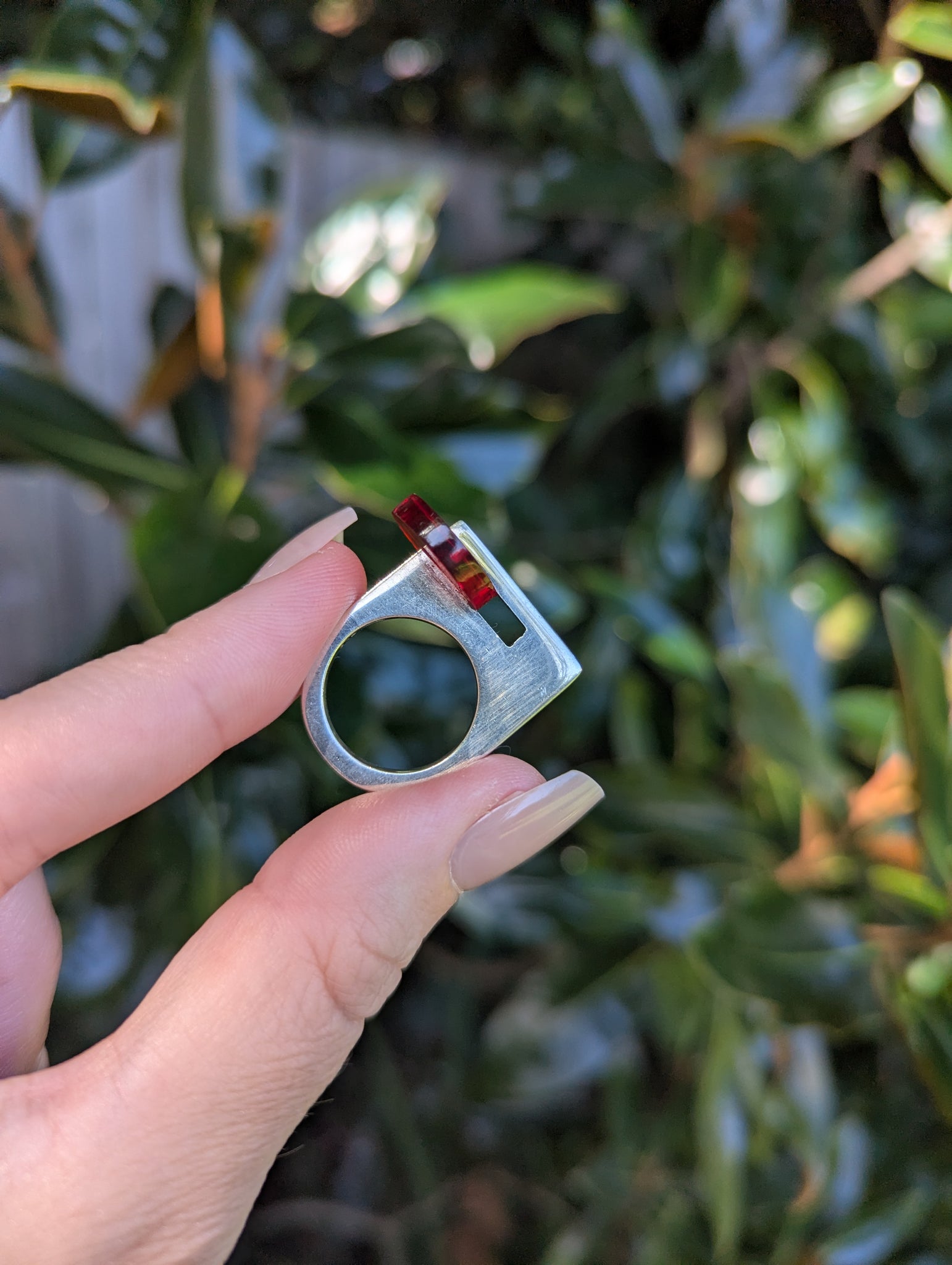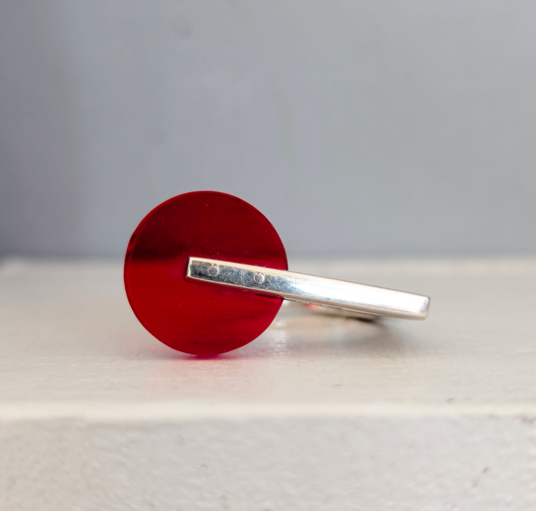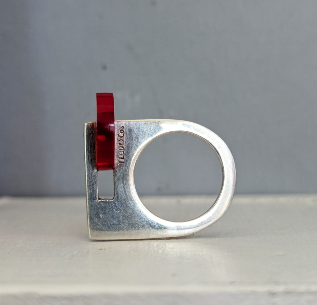 This sculptural handmade sterling silver ring has so many striking features, her single solid body and thick modernist construction makes for a wonderful design but perhaps the biggest eye catcher is the bright cherry red disc of lucite. The way it casts a red glow on the finger and how it has been thoughtfully set to one side for maximum impact. This is a beautiful piece designed and made in Mexico by Teresa Gonzalez in 1980s. It's fun bright and just a bit wow!