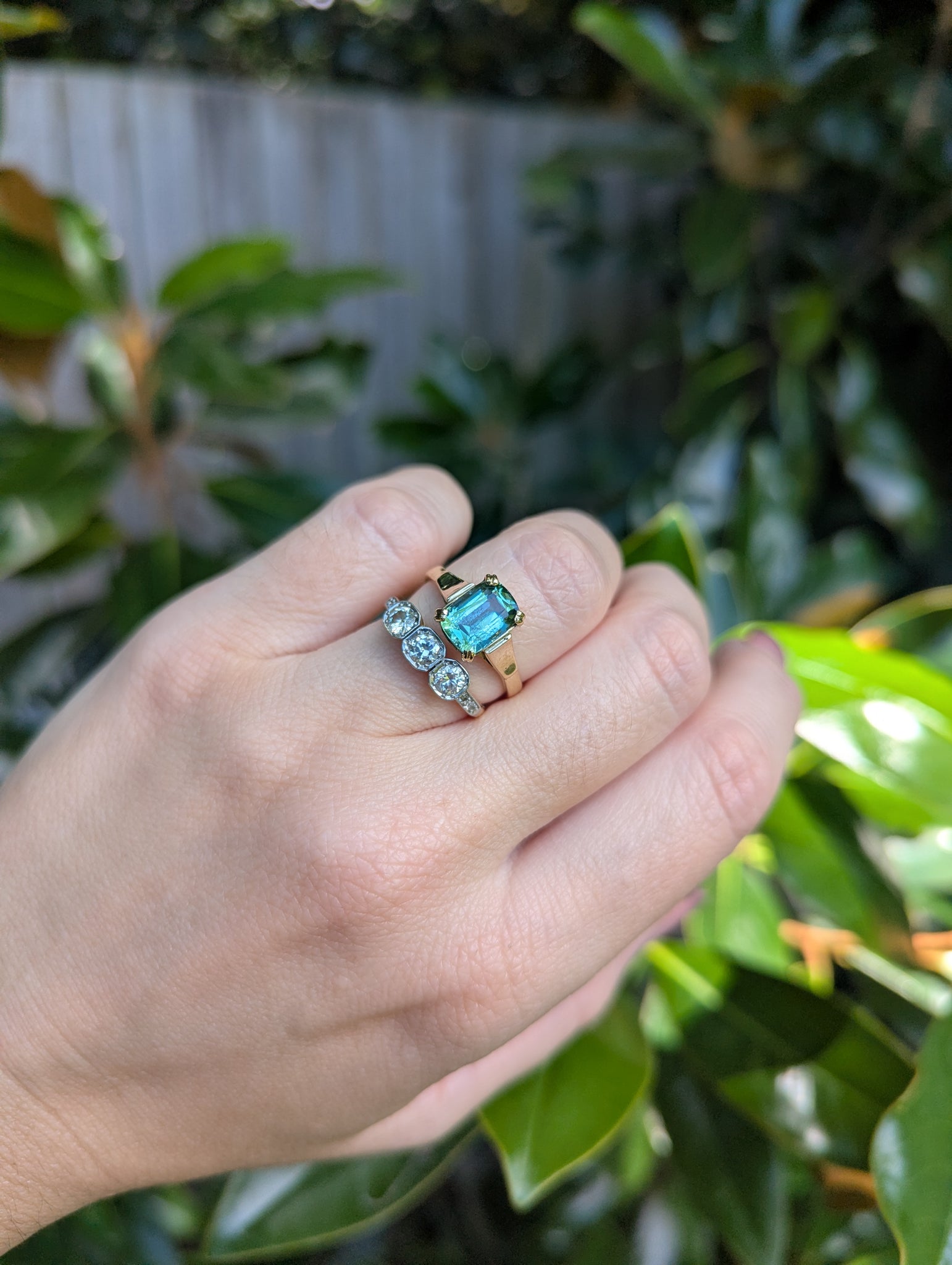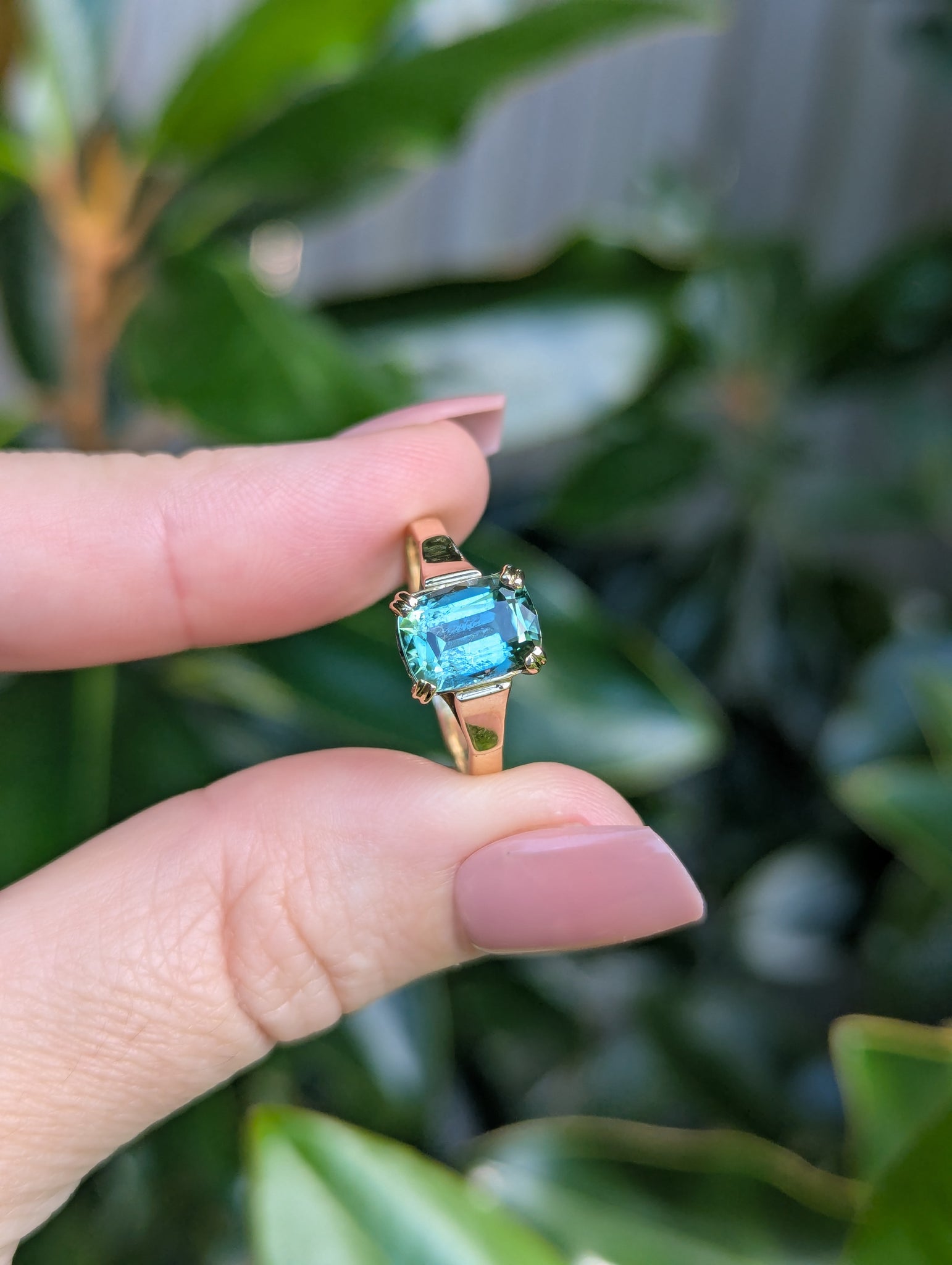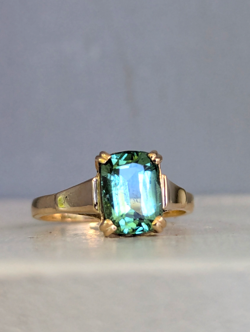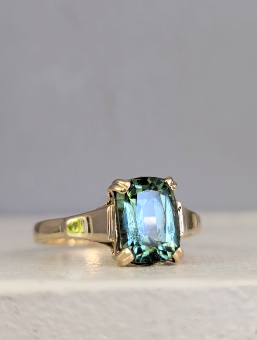 Enticing bi-colour tourmaline with flashes of blue and green that mix so perfectly like the waves in a sea cavern as they ebb and flow. The way the colours shift and move on the finger are just so enticing. The tranquil and calming vibes are only enhanced by 9ct handmade setting feature a simple gallery that allows this natural gemstone to sparkle and those lovely double claws holding her tightly. Some light wear to gold and tourmaline with visible natural inclusions.