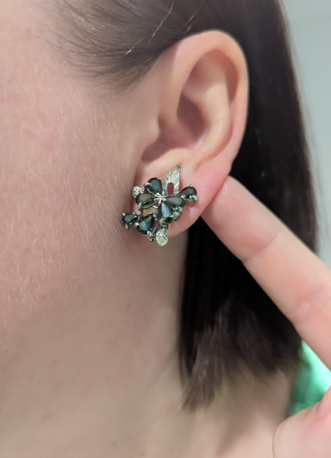 Divine 1950s style parti sapphire spray earrings. These stunning earrings would have been made in the 1970s in the style of the 1950s. With a whopping 14 pear cut parti sapphires in amongst textured leaves, they are such an eye-catching piece of design. Lovely 9ct white gold mounts with studs & hinged backs for easy and secure wear! Stunning colours from mid to bright green and blue they are such a lovely showcase of the array of colour found in Australian sapphires.