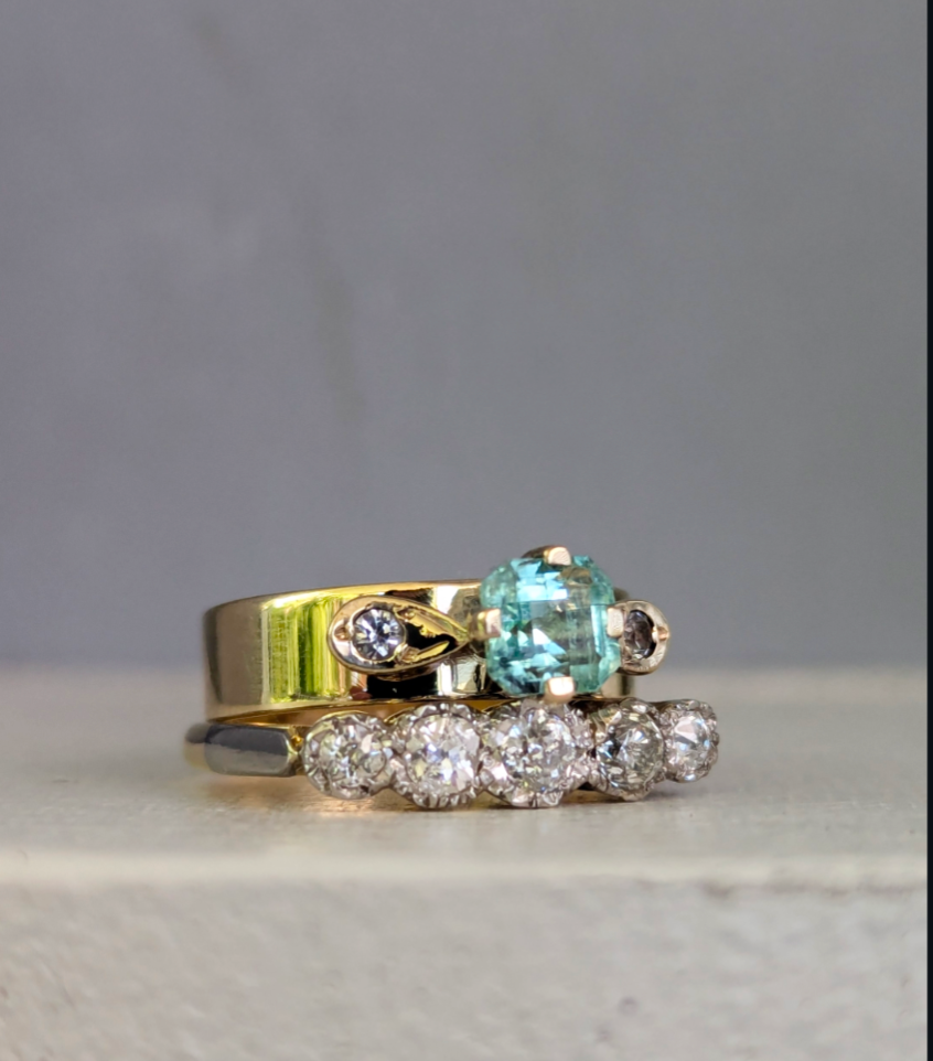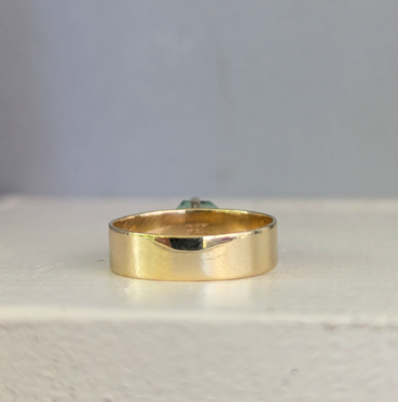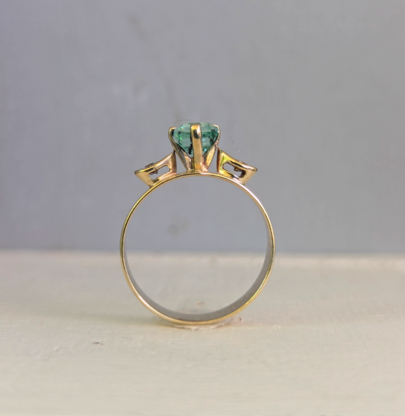 Sail away to paradise with this luminous green tourmaline! You can almost feel the white sand between your toes as you gaze into the vibrant green facets of this natural gemstone. The 9ct handmade yellow gold setting is the perfect match for this glowing tourmaline with sweet side set white spinels in little raised leaf shaped accents. Some light wear to gold and some natural inclusions to the green tourmaline.