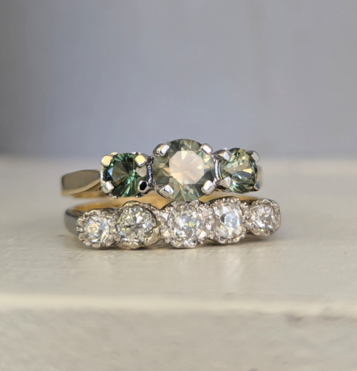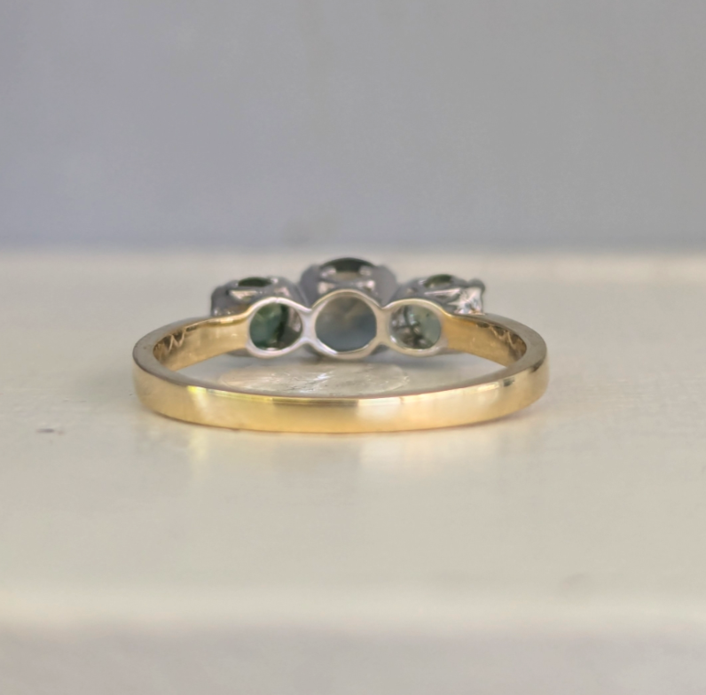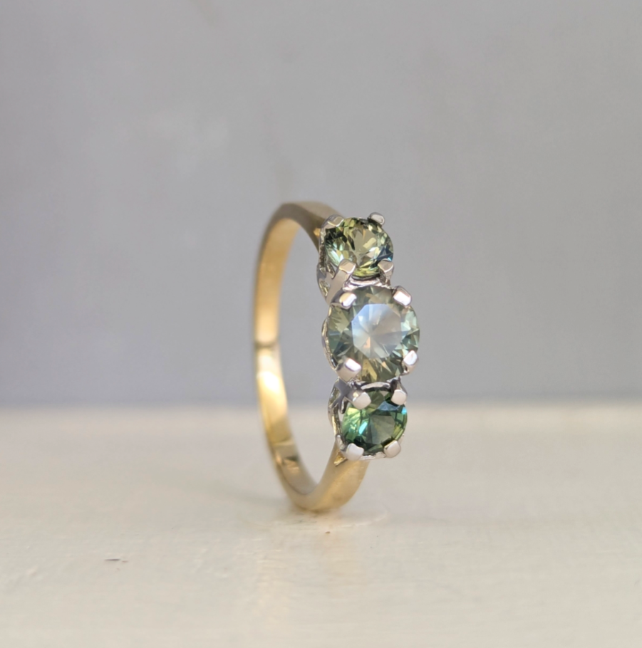 Soft delicate greens ebb and flow inside these magic qld sapphires with hints of yellow and blue peeking through! Each sapphire is always so unique and special and these remind me of the soft swaying reeds that used to grow along the creek where I grew up. These sapphires look so beautiful together and I especially love the soft muted colour of the centre sapphire! Light wear to gold and sapphires
