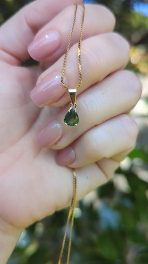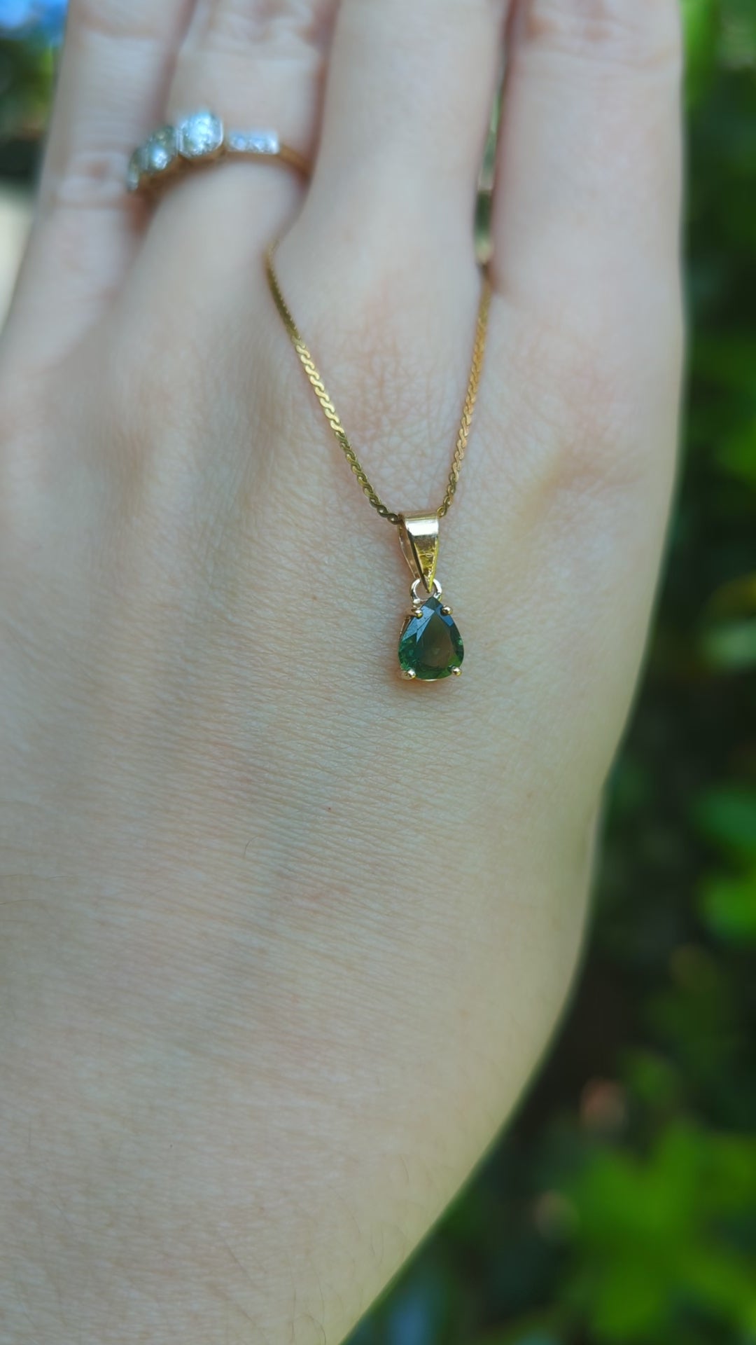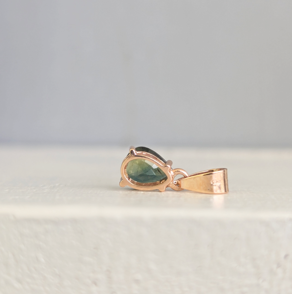 This gorgeous green pear sapphire is finally ready to be seen after decades in a private collection and few years in my jewellery box. I knew I wanted to save her for a pendant as I love a teardrop setting and wow she does not disappoint! Forrest greens flash through like looking up into the canopy of a tree. The rosey gold of this vintage setting gives her a lovely warmth and allows those green to shine. Light wear to gold and sapphire