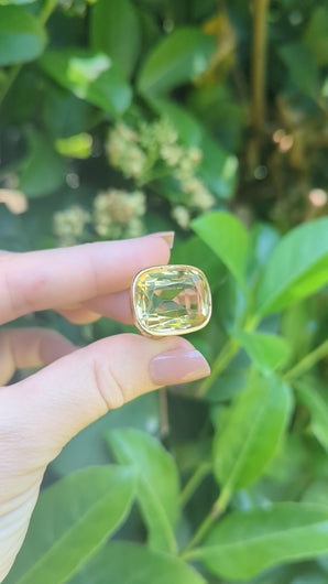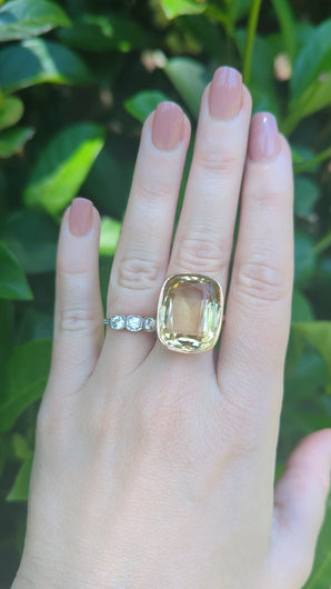 Impressive antique citrine with bright yellows that radiate warmth across her huge facets.According to the original owners son, this piece started life as a beloved brooch that was a gift from her father and was later expertly converted to a ring in the 40s as they gained popularity. This was her favourite ring and she loved it so much! The frame has been so well made to make the ring and brooch feel like one, I love the history of conversion pieces! Handmade in 9ct yellow gold with warm rosey hue she is a sight to behold. Citrine has some wear with small chip and peeks out below setting slightly. Gold has some wear inline with age.