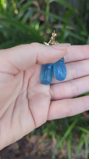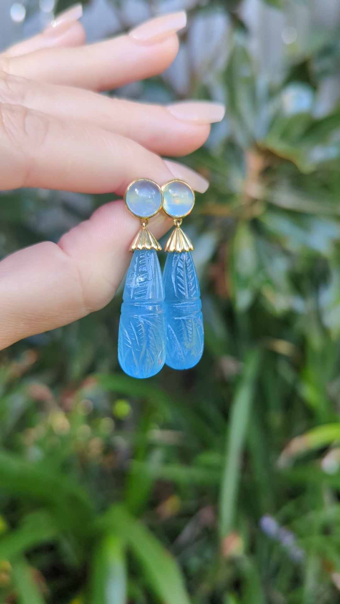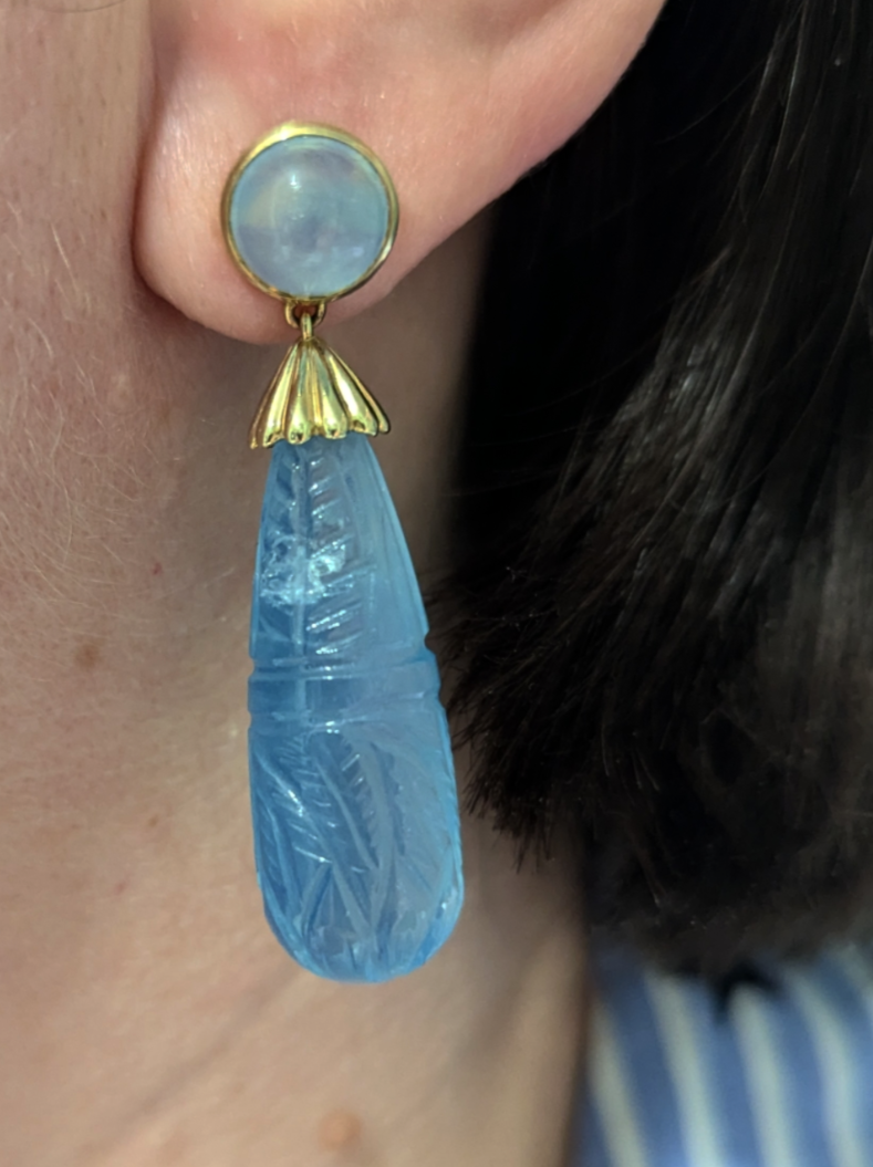 Opulent droplets of hand carved aquamarine cascade down with the irresistible cool calming blue this gemstone is prized for. Each carving depicts scenes full of flowers, leaves and winding rivers leading to paradise The ethereal glowing cabochons that hold them securely are so well balanced and glow like moonstones on the ear. Made of 10ct yellow gold the studs are butterfly backed and the fluted ribbed gold caps finish off this stunning design. Each drop is approx 30cts but they don't feel overly heavy, perhaps due to the style and weight distribution across each ear. These are surprisingly wearable and something I have worn to lunch, shopping, due to the carved nature they don't look overly extravagant (yes I just said that 😉). Theirs is a subtle elegance and they are perfect for someone looking to celebrate themselves with something truly magical