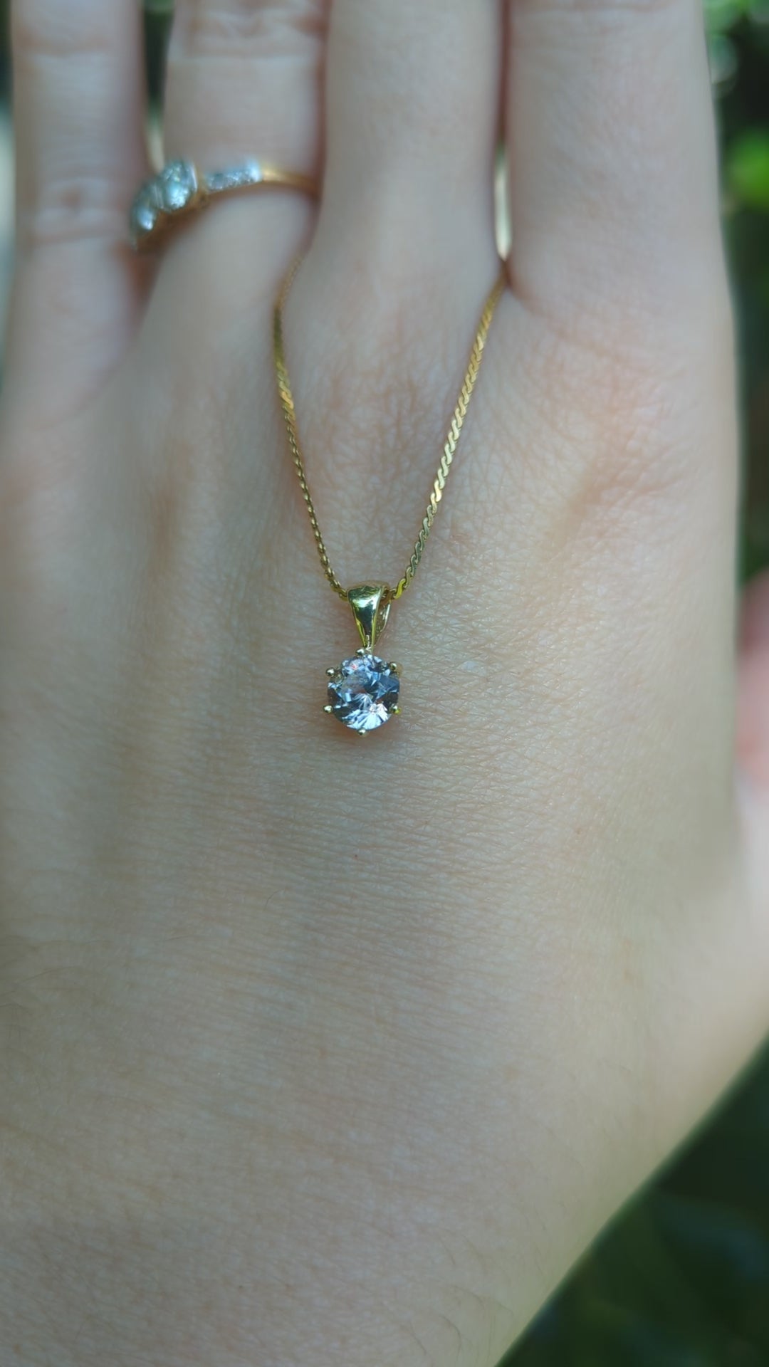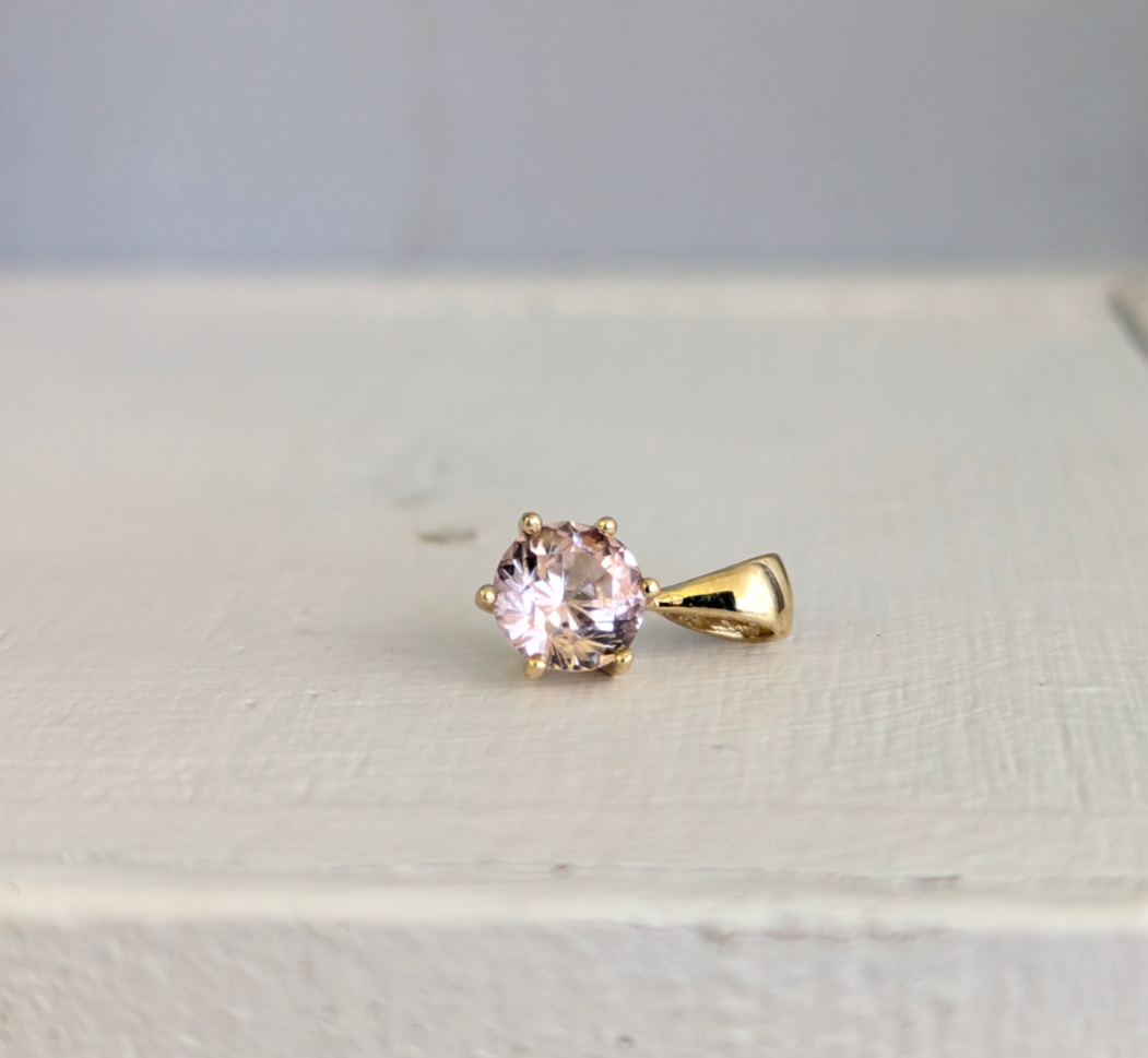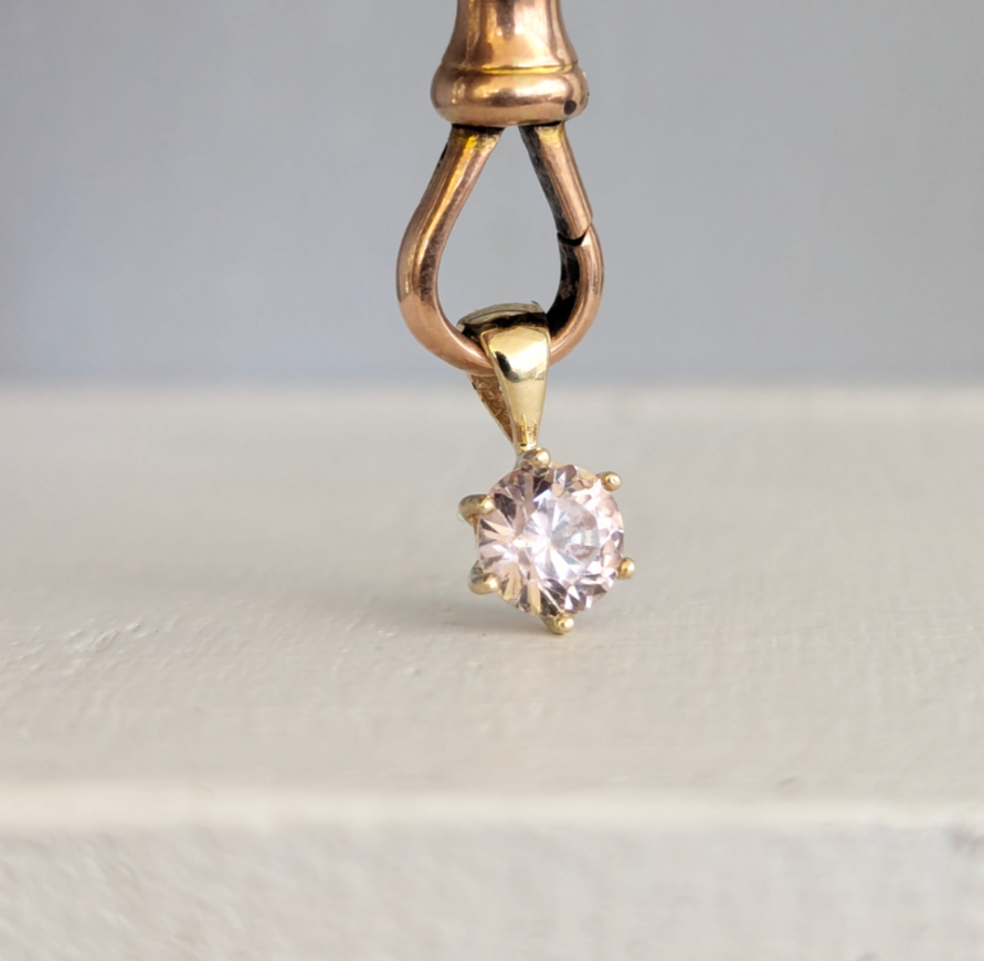 This darling pale pink zircon was a piece locally mined in the Harts ranges and cut by hand in the 1980s. Her soft ballerina pink is so special and unlike any other gemstone I have seen. The colour takes me to memories of breathing in the subtle perfume of my mother's roses and their delicate petals. This natural zircon sparkles beautifully in the multiclaw 9ct yellow gold setting. Like a twinkling star near your heart. Light wear to gold and zircon