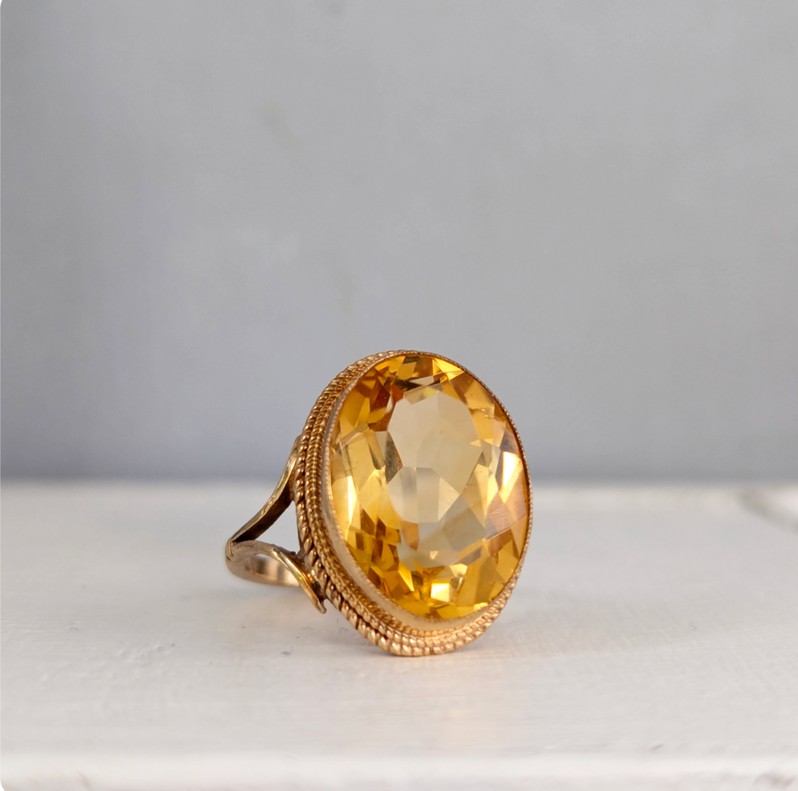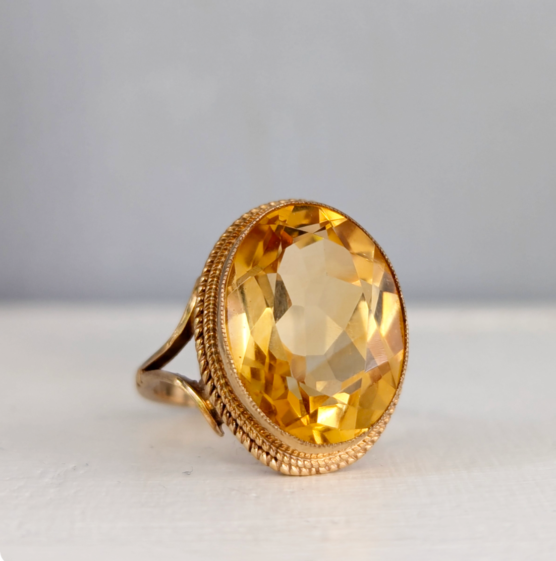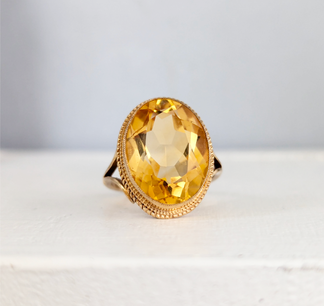 Sunshine flashes through this warm citrine cocktail ring with her beautifully oval faceting. This vintage piece is a classic English design with those gorgeous split shanks and the barley twist halo. This design has been a favourite of mine personally with a few in my personal collection. This heavy example features hallmarks for 9ct yellow gold Birmingham W.J.E 1973. The citrine is in great condition with minimal wear to surface and the gold.