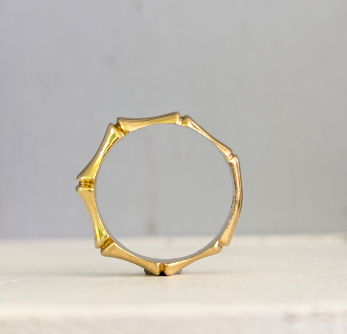Bamboo bands are definitely a love of mine, the texture and shapes are just so beautiful to admire and to mix up your stack style! Alot of requests come through for bamboo bands so they are a lot harder to find now. This exceptional example has a gorgeous chucky look but the wonderful thoughtful jeweller that designed this added a feature for comfort, the back band is not concave it is prone with the softeness of a standard band making this extremely comfortable to wear! The comfort is added whilst still maintaining the tactile details that really captured my eye! Made of 9ct yellow gold. She has some light wear but in good overall condition. Hallmarked 9ct