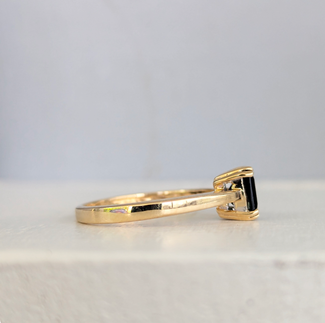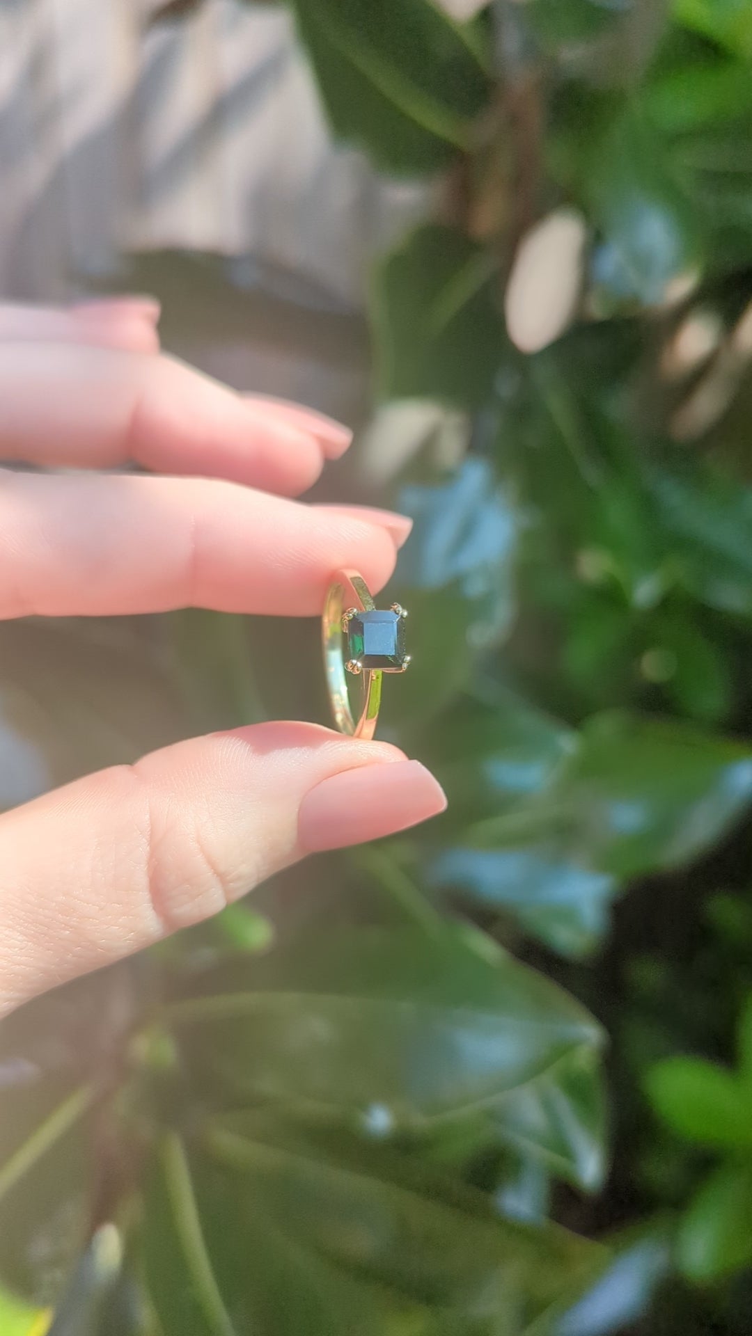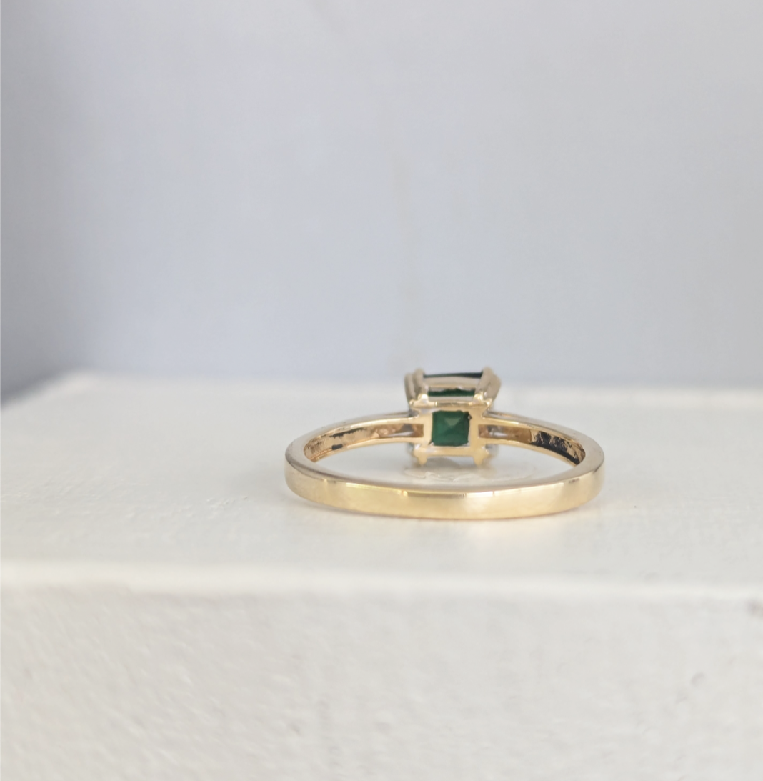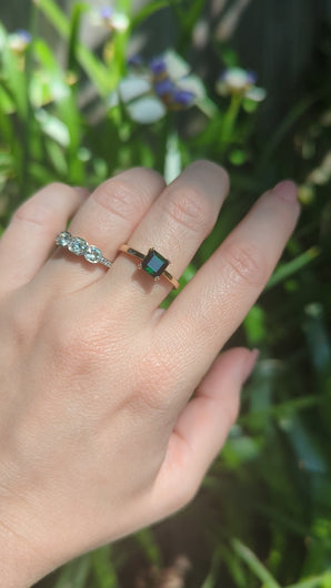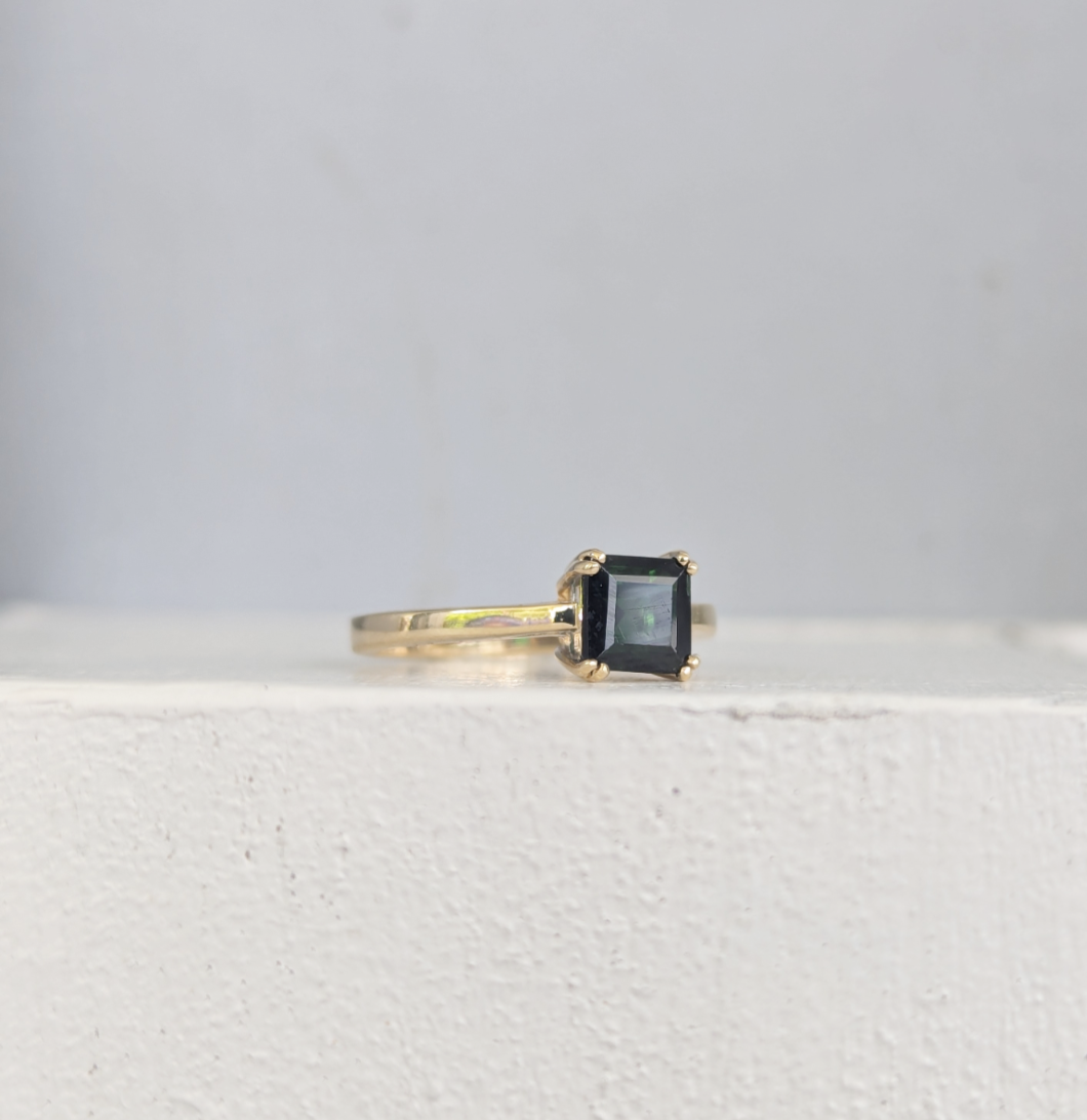 This natural green tourmaline is like a cool walk through the rainforest with deep glossy green leaves flashing under the sunshine. Her deep sparkle with forrest greens is like the swaying leaves overhead as the sun peeks through the thick canopy above! Set in 9ct yellow gold this classic design adds some extra details with those four double claws which always add such a lovely details! Light wear to gem and gold.