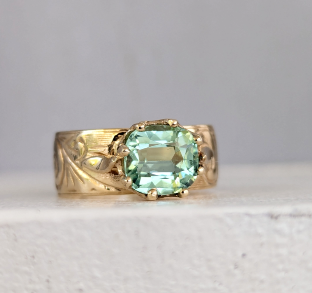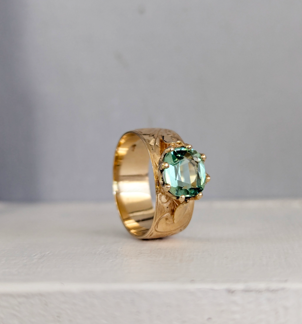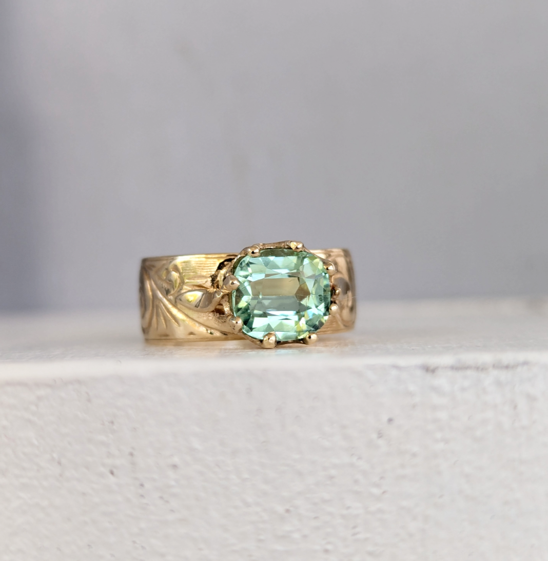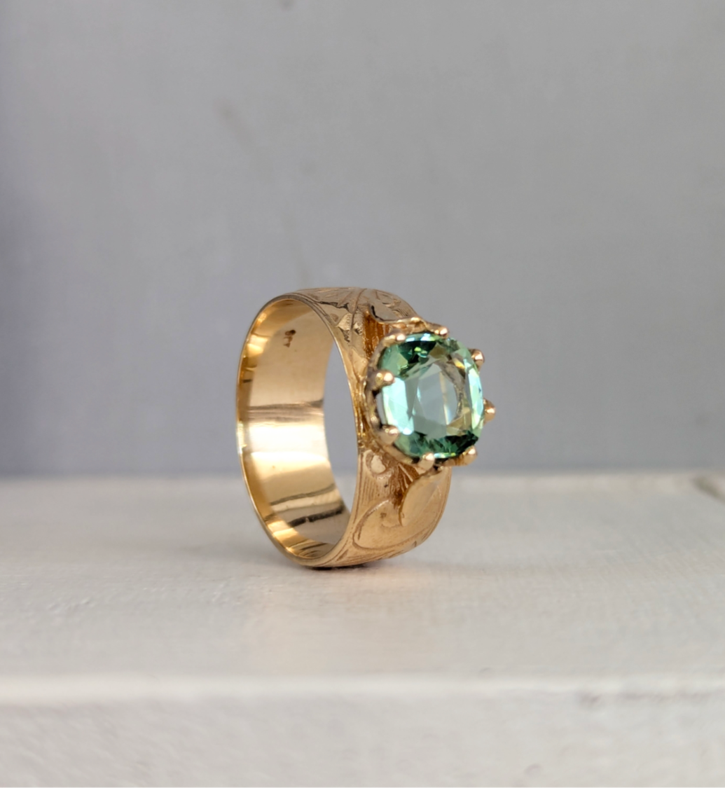 This was such a thrilling find with that captivating fresh green tourmaline front and centre. The wide band in rich 9ct yellow gold is the perfect backdrop and that multi claw setting acts like a ornate Renaissance portrait to frame this special natural gemstone. The acanthus engravings add another layer to this marvelous design. She is ready to be loved and stacks so easily with all bands and adds instant impact. The style looks like c1980s and they loved these bands then! Perhaps the setting was added on at a later date but with all rings something remain a mystery. Light wear to gold and tourmaline.