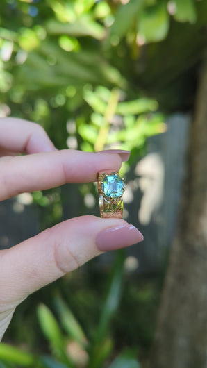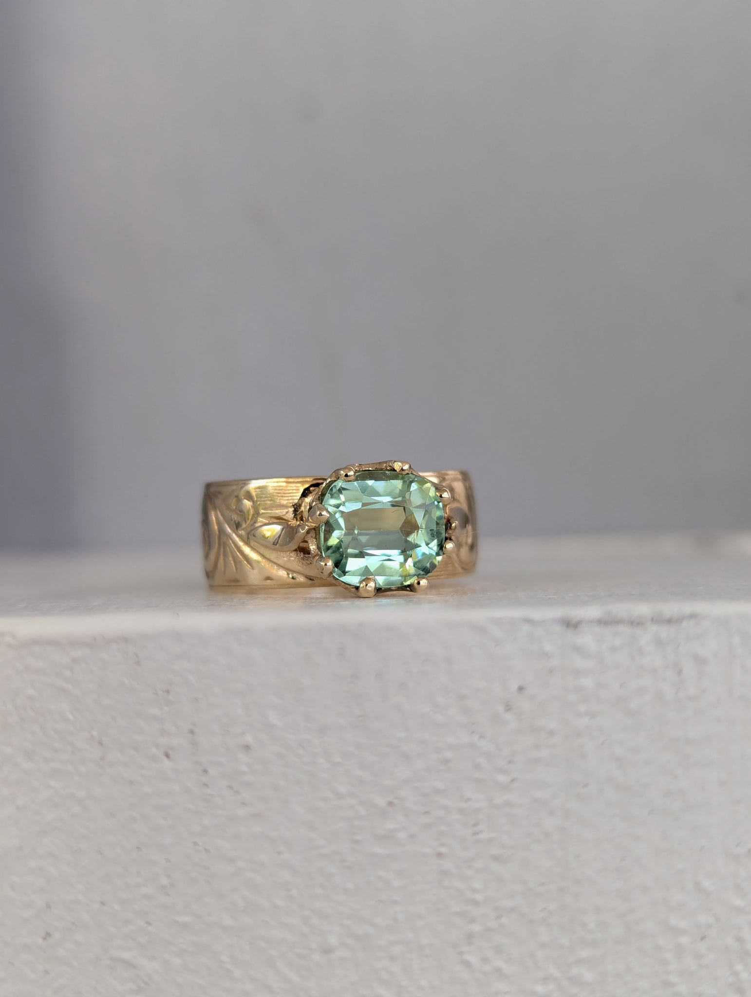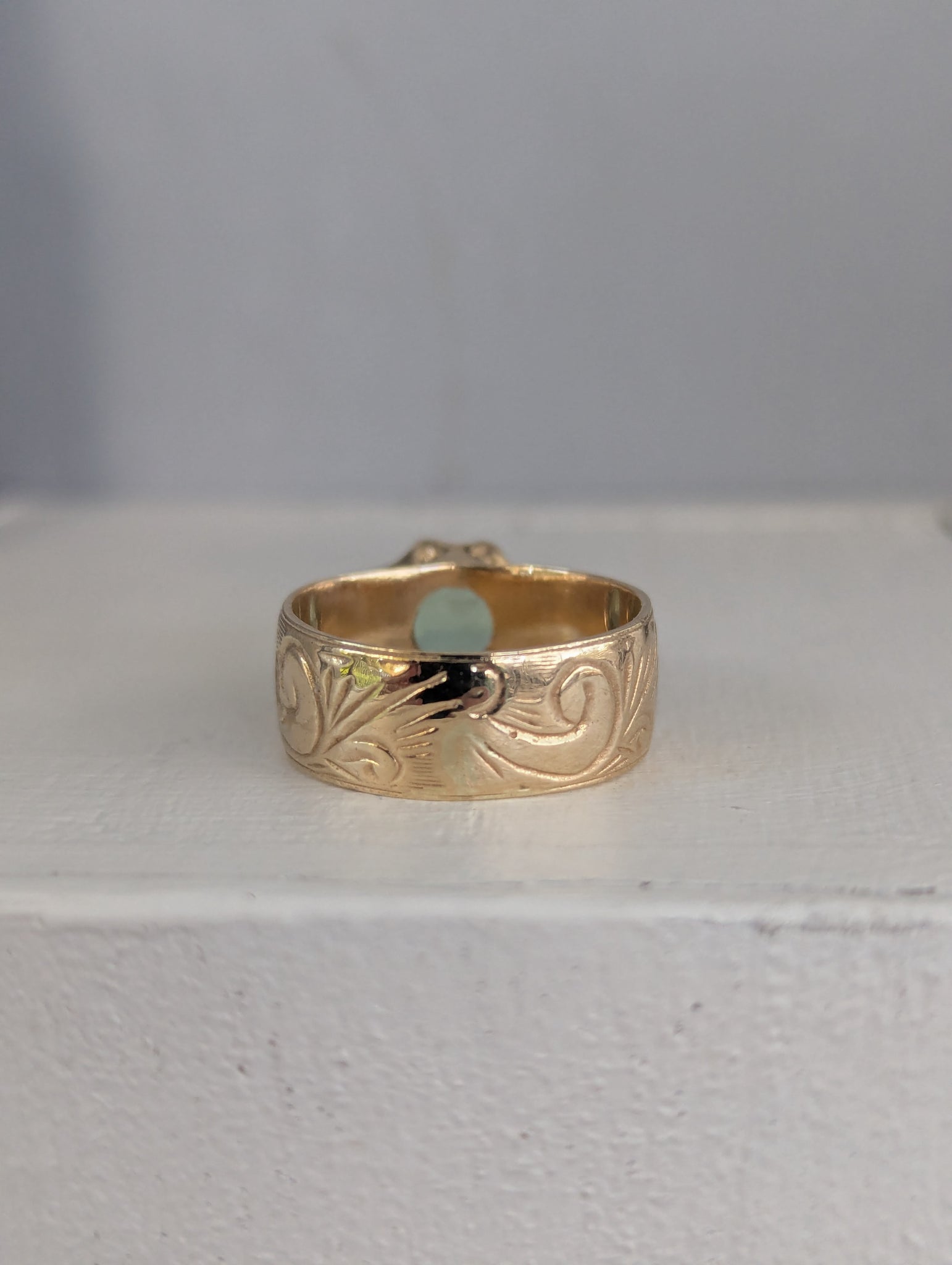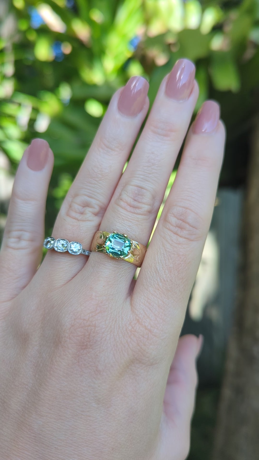 This was such a thrilling find with that captivating fresh green tourmaline front and centre. The wide band in rich 9ct yellow gold is the perfect backdrop and that multi claw setting acts like a ornate Renaissance portrait to frame this special natural gemstone. The acanthus engravings add another layer to this marvelous design. She is ready to be loved and stacks so easily with all bands and adds instant impact. The style looks like c1980s and they loved these bands then! Perhaps the setting was added on at a later date but with all rings something remain a mystery. Light wear to gold and tourmaline.