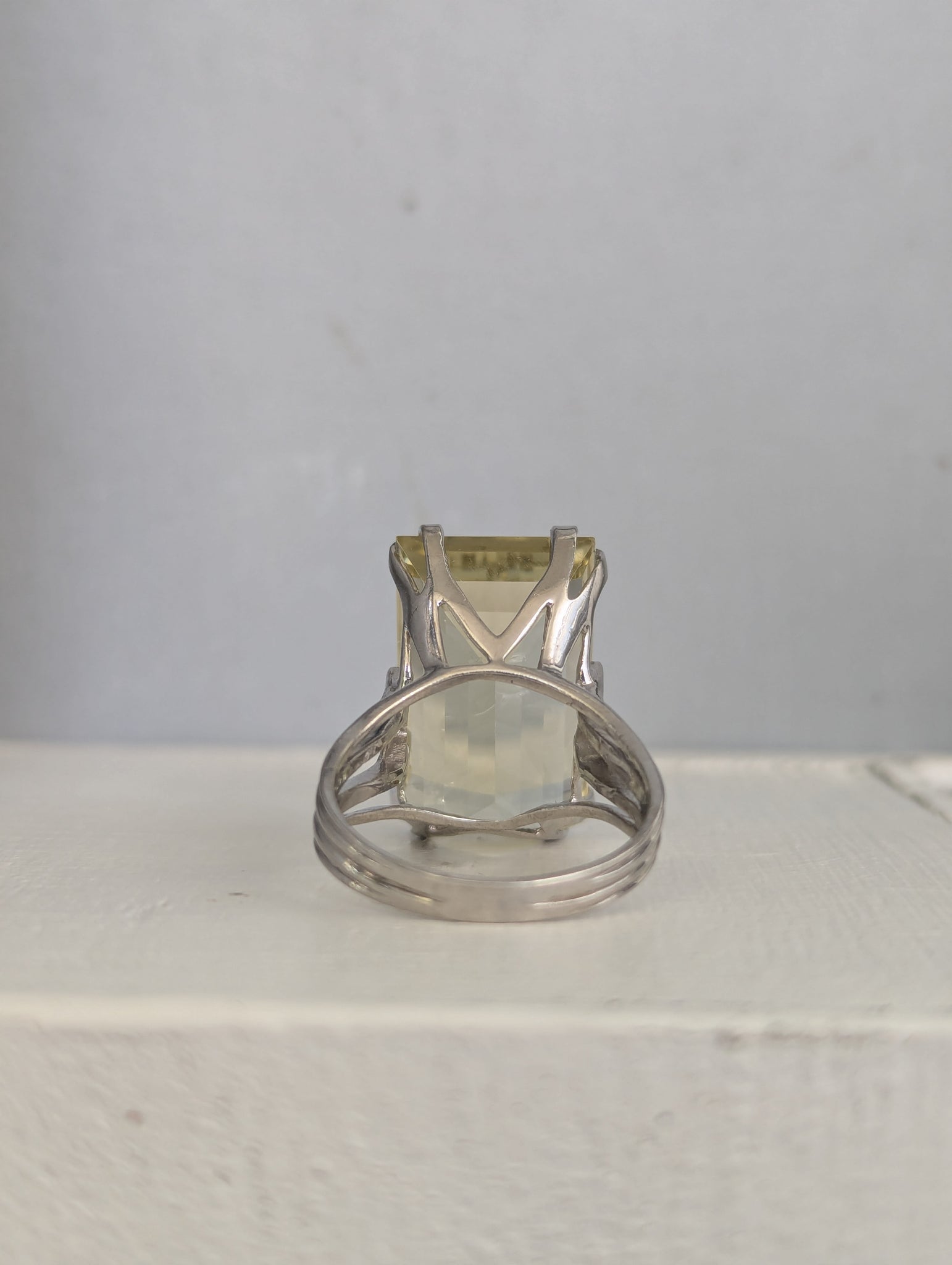 This tantalising citrine is so refreshing with her subtle lemon lime sparkle full of flash and fun! That stunning elongated step cut looks so elegant along the finger with such great proportions at a huge 20cts. Then we spy this fabulous double split claws that reach up to hold this sparklinging beauty! This solid 9ct white gold setting is the perfect backdrop to show of the lemon sunshine citrine and her open art deco influence gallery allows this magnificent gemstone to be admired from any side! Light wear to citrine and some wear to gold