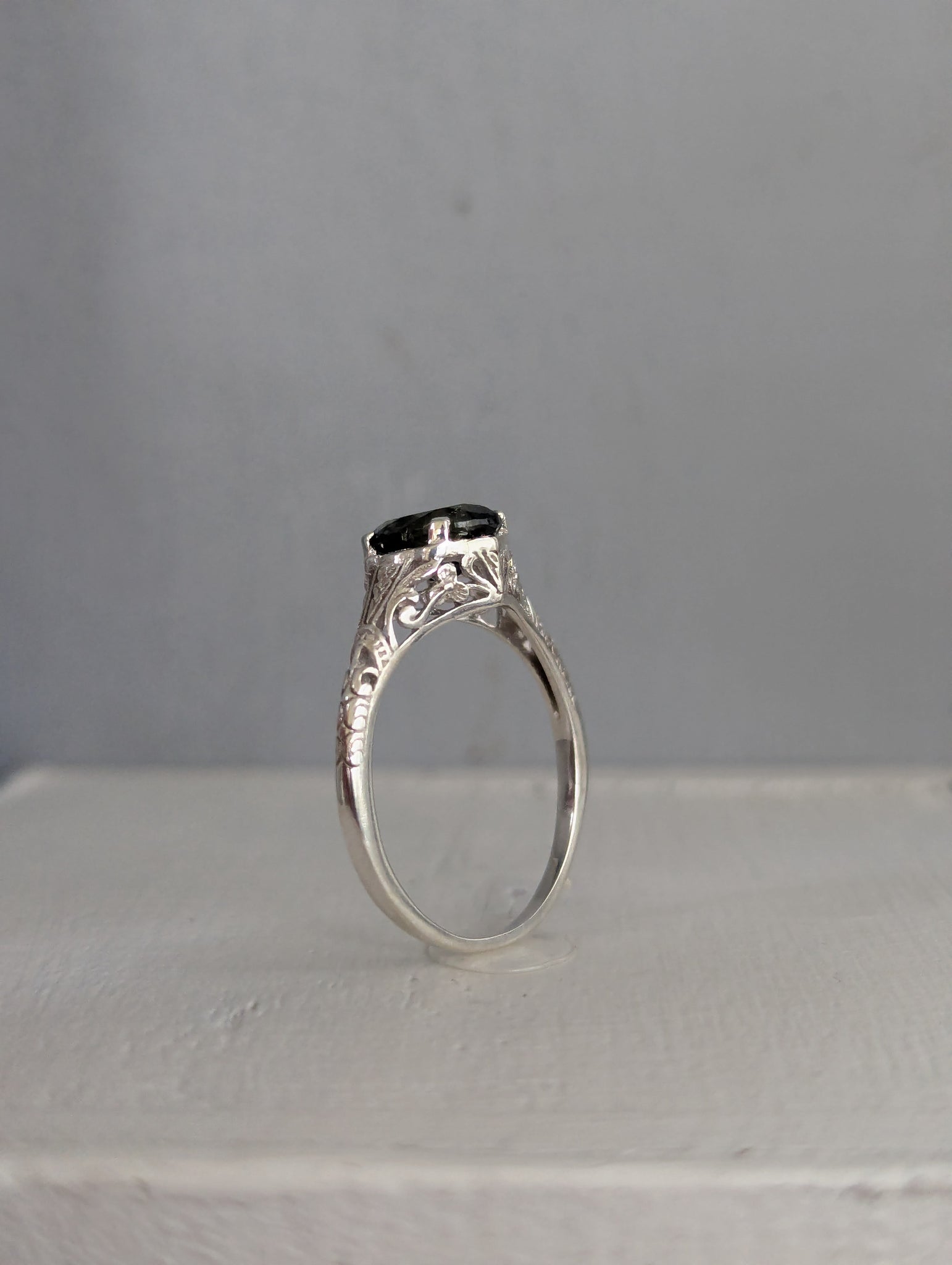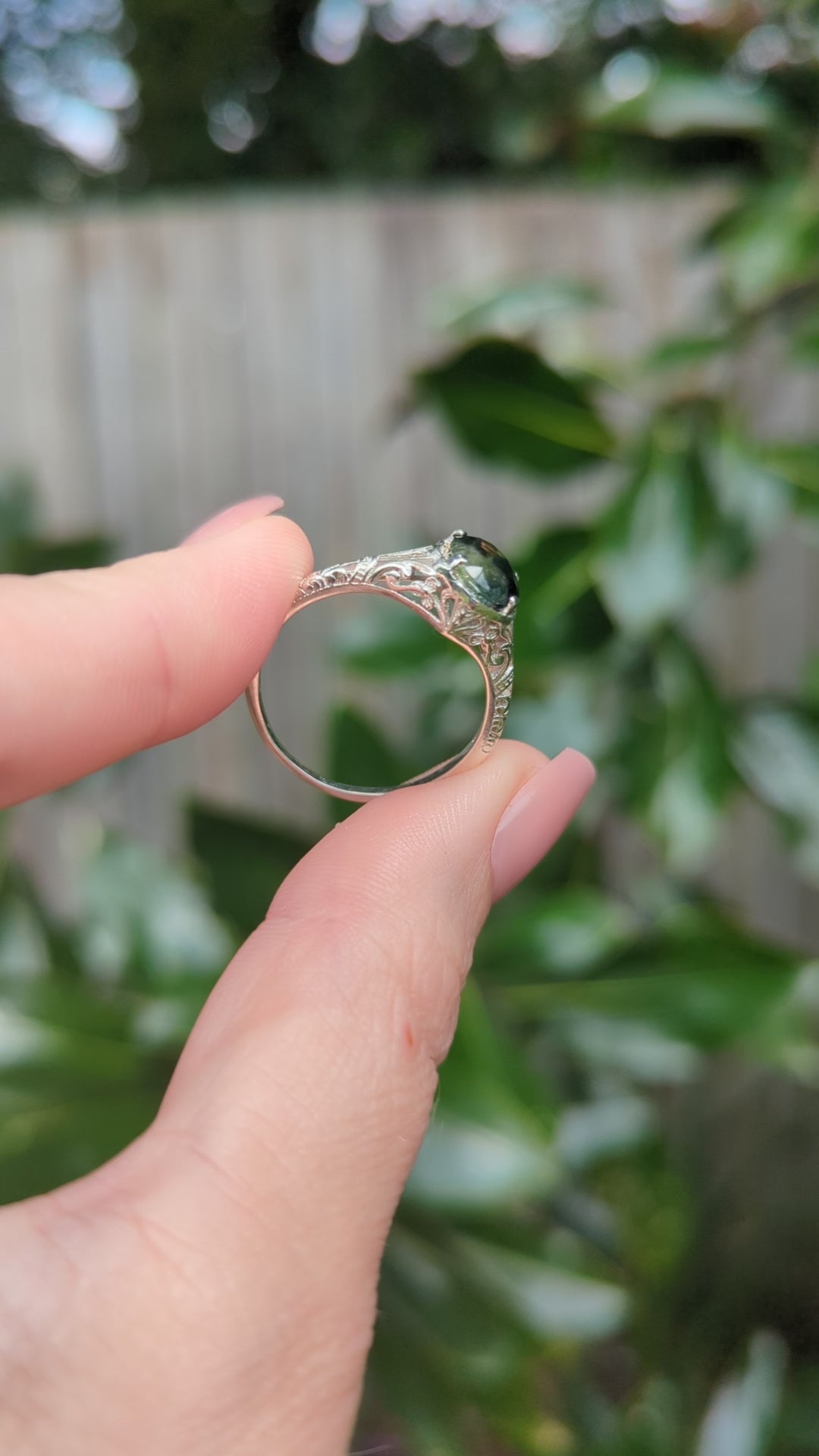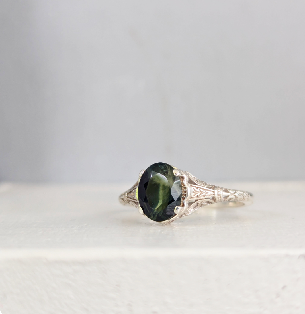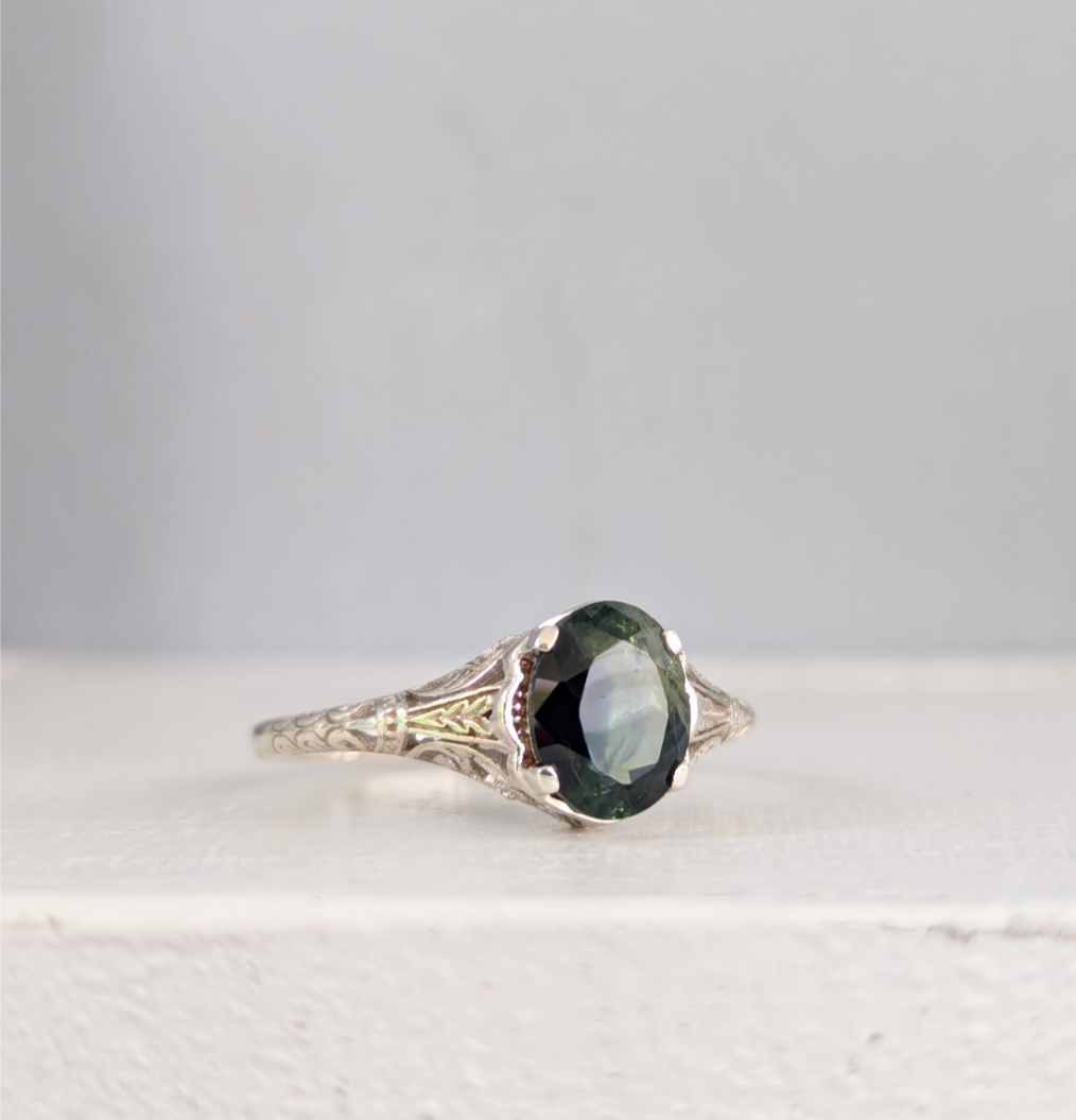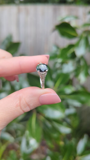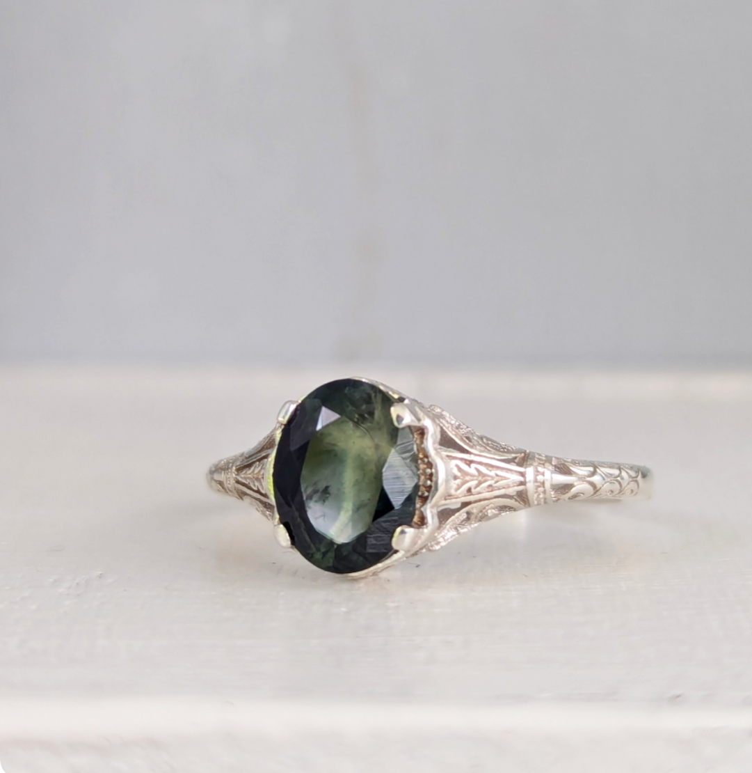 Well I had to have this little sterling silver number with that stunning moulded filigree setting and her large Australian parti sapphire. What a beautiful design to showcase the blue green colours of this lovely sapphire. Like moss growing through the creek the colours and natural inclusions really make this a beautiful example of nature. Lovely condition and affordable price being silver