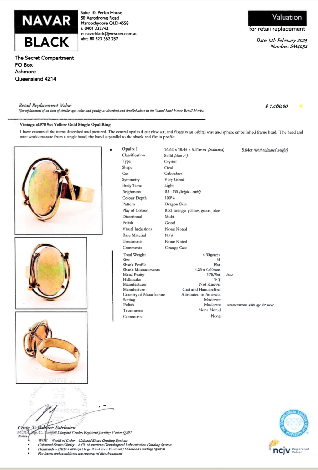 Bringing the 🌈 today with this phenomenal vintage solid opal. The full spectrum of colours is present in this huge solid cabochon of dragon skin crystal opal from red, orange yellow green and blue every hue between. Her flat wide band hold this magical gemstone securley and her artful wire swirl acts as a delicate halo and some protection from knocks. Likely Coober Pedy origins know for their top grad crystal opal. Lovely 5.64cts with no cracks or chips etc. Light wear to gold.